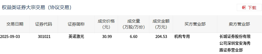9月3日,英诺激光大宗交易成交6.6万股,成交额204.53万元,占当日总成交额的1.1%,成交价30.99元,较市场收盘价37.55元折价17.47%。