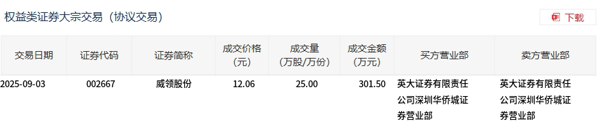 9月3日,威领股份大宗交易成交25万股,成交额301.5万元,占当日总成交额的1.42%,成交价12.06元,较市场收盘价12.69元折价4.96%。