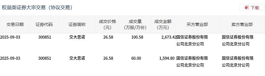 9月3日,交大思诺大宗交易成交160.58万股,成交额4268.22万元,占当日总成交额的55.77%,成交价26.58元,较市场收盘价26.78元折价0.75%。