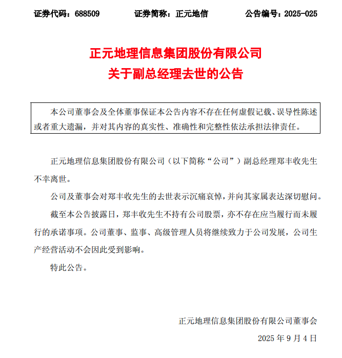 9月3日下午,正元地信公告,公司副总经理郑丰收不幸离世。公司及董事会对郑丰收的去世表示沉痛哀悼,并向其家属表达深切慰问。截至本公告披露日,郑丰收不持有公司股票,亦不存在应当履行而未履行的承诺事项。公司董事、监事、高级管理人员将继续致力于公司发展,公司生产经营活动不会因此受到影响。