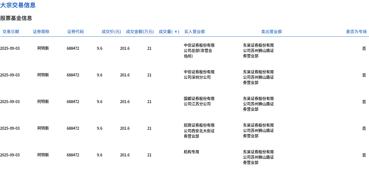 9月3日,阿特斯大宗交易成交105万股,成交额1008万元,占当日总成交额的0.93%,成交价9.6元,较市场收盘价10.53元折价8.83%。