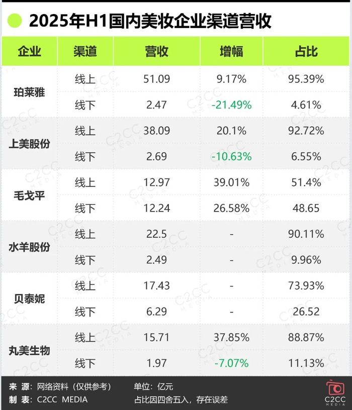 另一边多数美妆企业线上营收占比突破90%,且线上渠道持续增长,如毛戈平增幅高达39.01%。