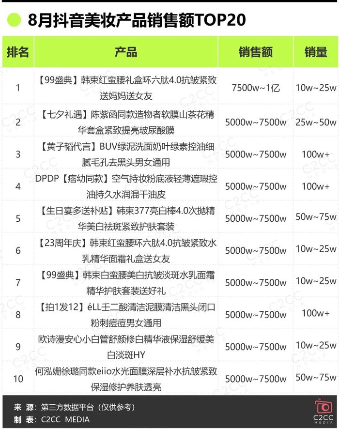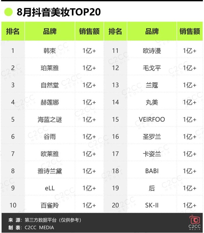 8月抖音美妆TOP20:韩束持续领跑、抖品牌遇冷