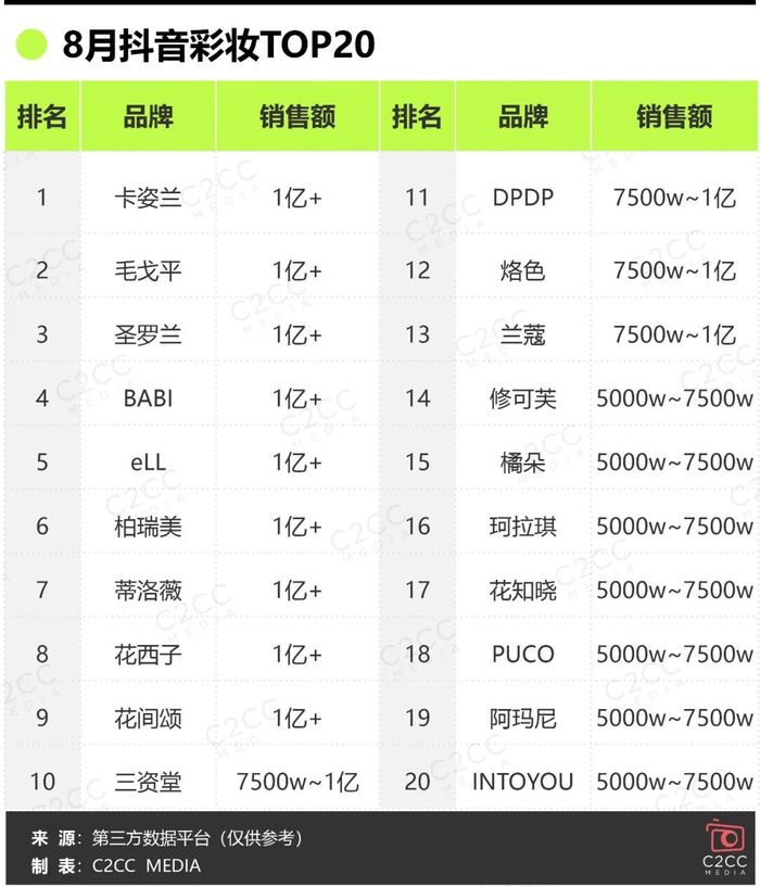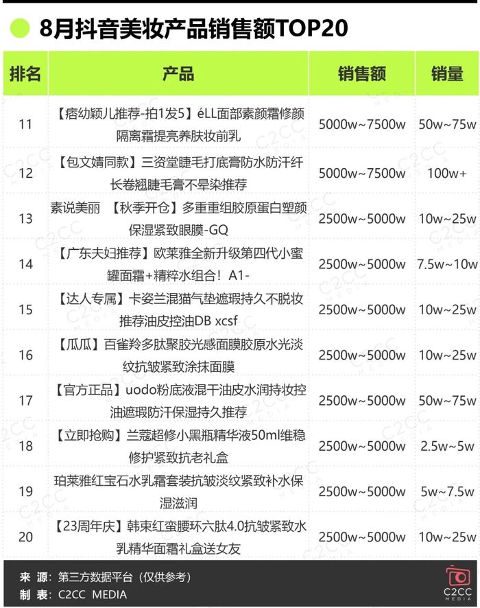 8月抖音彩妆TOP20:50~100元国货爆款领跑