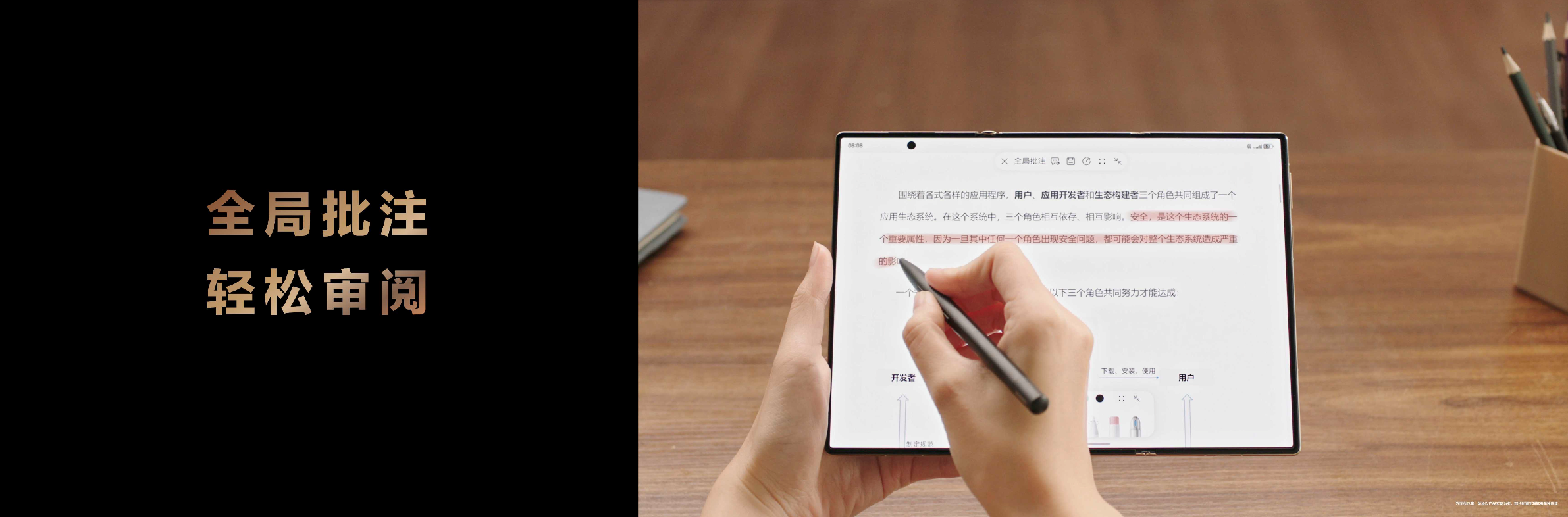 高效的工具能够让创意和工作更加得心应手。华为Mate XTs 非凡大师配备了手写笔M-Pen 3。结合三折叠大屏形态,它不仅支持批注、摘录、速记、智慧圈搜等基础功能,还能够一键切换成“空鼠模式”进行遥控翻页,甚至在息屏状态下,用笔滑动屏幕就可以快速调出华为笔记,将灵感快速记录下来——在体验看齐PC的同时,也发挥了手机作为便携设备的优势。