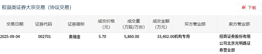 9月4日,奥瑞金大宗交易成交5860万股,成交额3.34亿元,占当日总成交额的65.21%,成交价5.7元,较市场收盘价5.57元溢价2.33%。