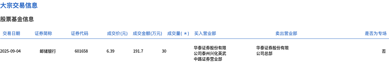 邮储银行今日大宗交易平价成交30万股,成交额191.7万元