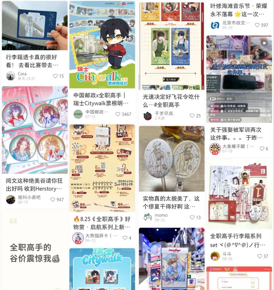 以《全职高手》为例,2014年连载完结后,除了伴随小说出版的特典番外,其正文内容并未更新。在动漫、广播剧等衍生内容推出之余,各类周边开发和不同主题的衍生品制作,也构成了粉圈的重要探讨内容。