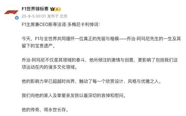 当地时间9月4日,意大利著名时装设计师乔治·阿玛尼去世,享年91岁。阿玛尼集团宣布,遵照本人明确意愿,葬礼将不对外公开。随后,F1主席兼CEO斯蒂法诺·多梅尼卡利发文悼念称,阿玛尼的影响力早已超越时尚界,触动了每一个欣赏设计、风格与优雅之人,“他的传奇,将永世长存”。