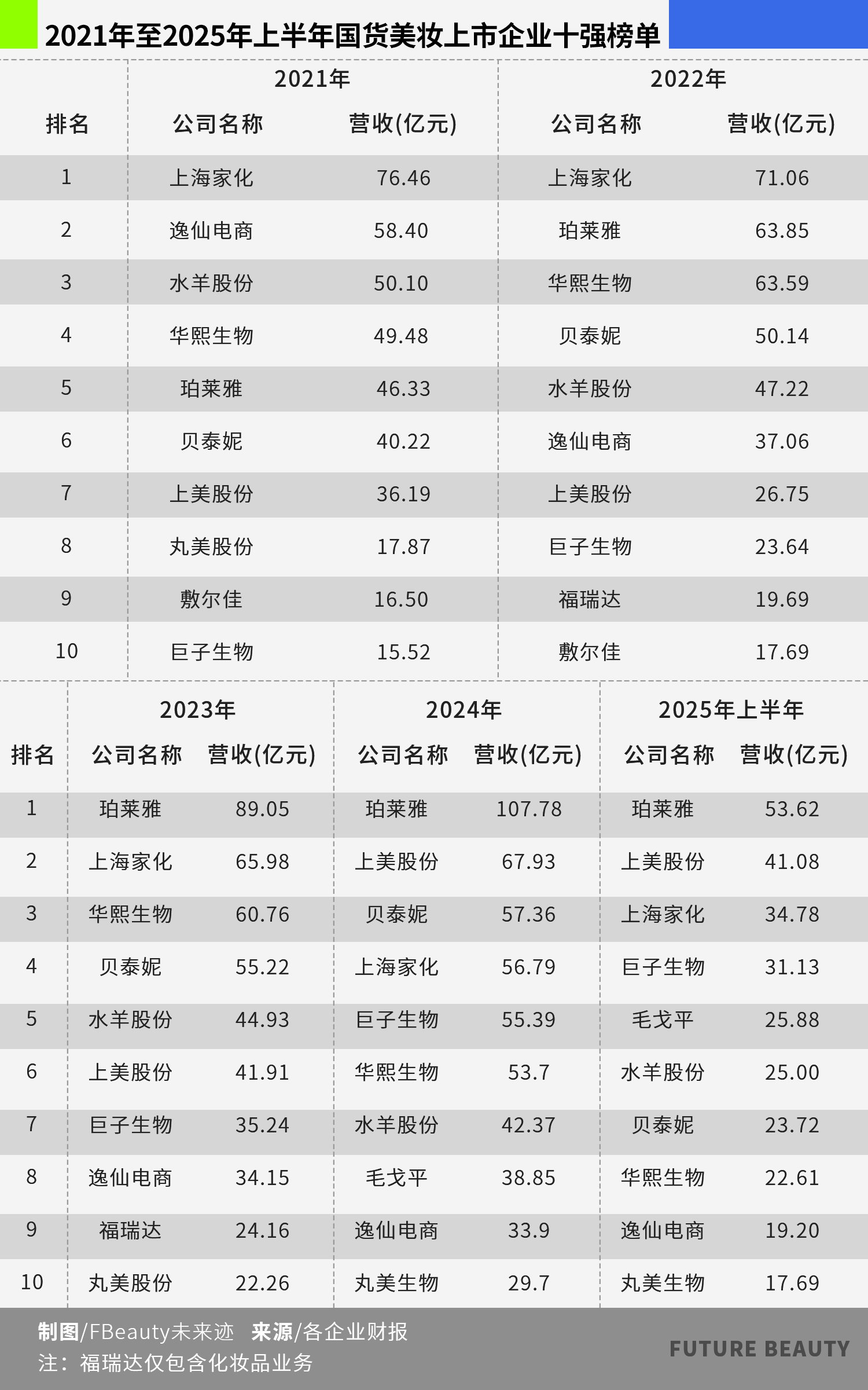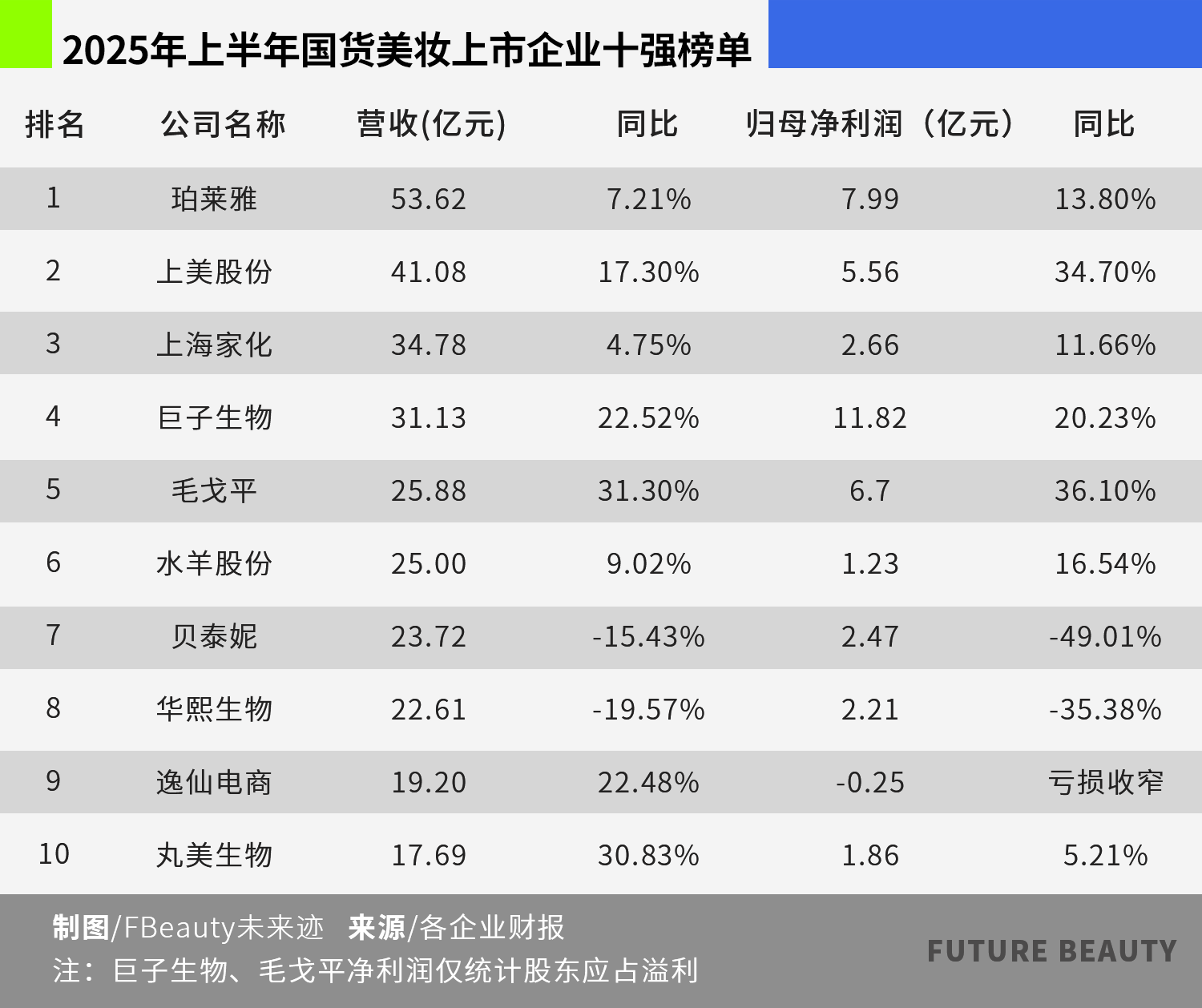 与此同时,随着各大国货美妆上市企业半年报的出炉,十强榜单也随之揭晓。2025上半年国货美妆十强财报,不仅是一张“谁卖得更好”的成绩单,更是一幅头部企业紧急谋变、寻找新活法的战略路线图。