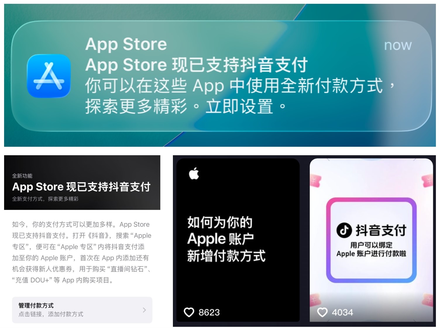 此前,已有媒体报道Apple正在灰度测试引入抖音支付作为新的付款方式。9月4日、5日,双方均在官方渠道发布上述信息,意味着灰测已经结束,开始正式面向中国大陆用户。