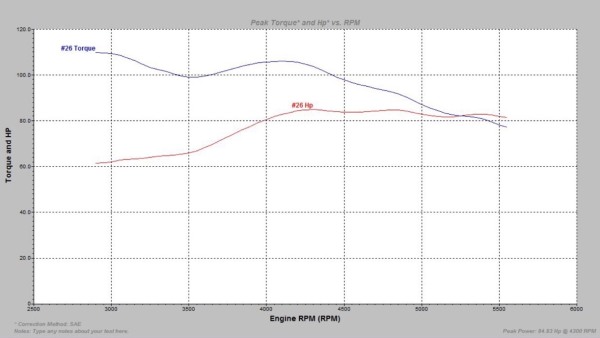 下图可以看到结果让我们很失望,SAE标准的修正下轴上显示马力只有84.8匹(红线是马力,蓝线是扭力),比我们预期的原厂111.35少了26.55匹的动力,这是少了1/4的动力啊,本来100多匹的壮马,竟然就剩下80多了。