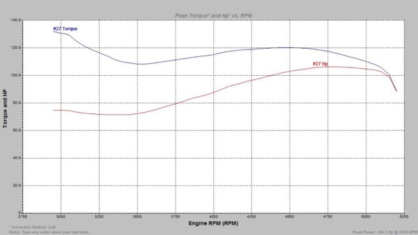 结果如下,出乎意料的这辆C50跑出了106.2匹的成绩,经过5万公里的使用和磨损,动力输出比出厂状态的111.35只少了大概5匹而已,比上一辆测试车好的不是一点半点。