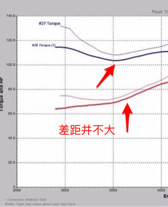 下图是放大前段动力(发动机低速)我们可以看到动力处于4250转及以下时,两车动力差距较小,尤其是3250到4250之间,马力差距更是只有几匹,而这段转速一般也是我们城市正常驾驶用的比较多的转速,所以在一般试驾中很难感受到两车的区别。