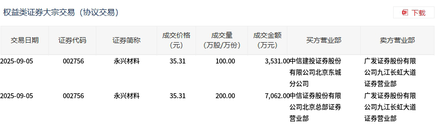 9月5日,永兴材料大宗交易成交300万股,成交额1.06亿元,占当日总成交额的10.04%,成交价35.31元,较市场收盘价36.22元折价2.51%。