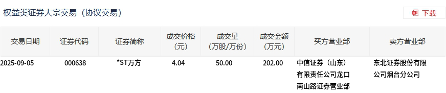 9月5日,*ST万方大宗交易成交50万股,成交额202万元,占当日总成交额的1.16%,成交价4.04元,较市场收盘价4.23元折价4.49%。