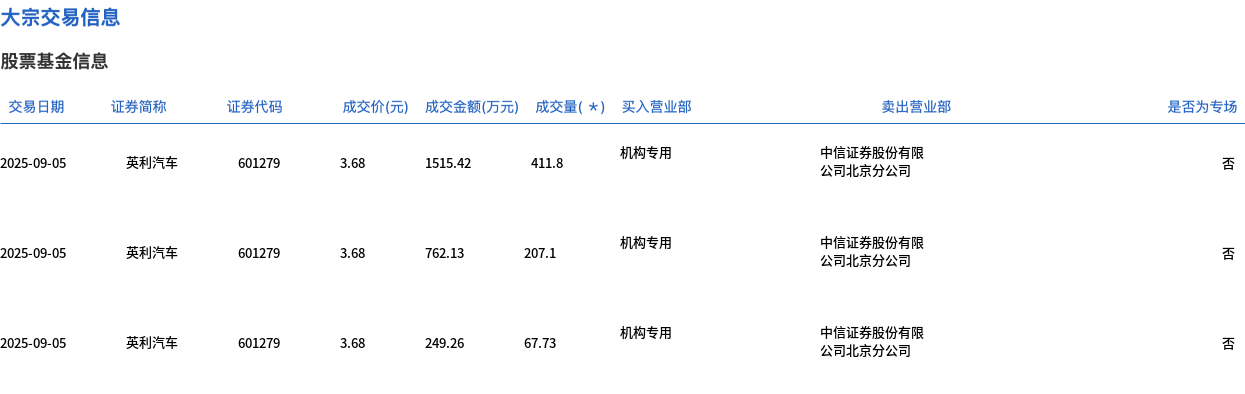 9月5日,英利汽车大宗交易成交686.63万股,成交额2526.81万元,占当日总成交额的23.85%,成交价3.68元,较市场收盘价4.21元折价12.59%。
