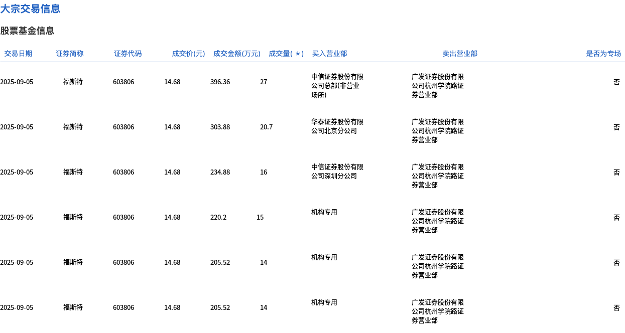 9月5日,福斯特大宗交易成交106.7万股,成交额1566.36万元,占当日总成交额的1.21%,成交价14.68元,较市场收盘价16.13元折价8.99%。
