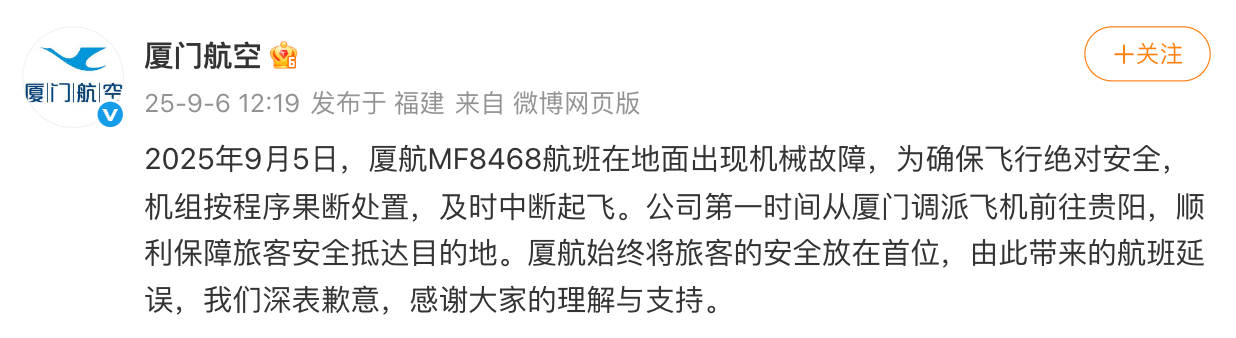 厦门航空9月6日通报,9月5日,厦航MF8468航班在地面出现机械故障,为确保飞行绝对安全,机组按程序果断处置,及时中断起飞。公司第一时间从厦门调派飞机前往贵阳,顺利保障旅客安全抵达目的地。厦航始终将旅客的安全放在首位,由此带来的航班延误,我们深表歉意,感谢大家的理解与支持。