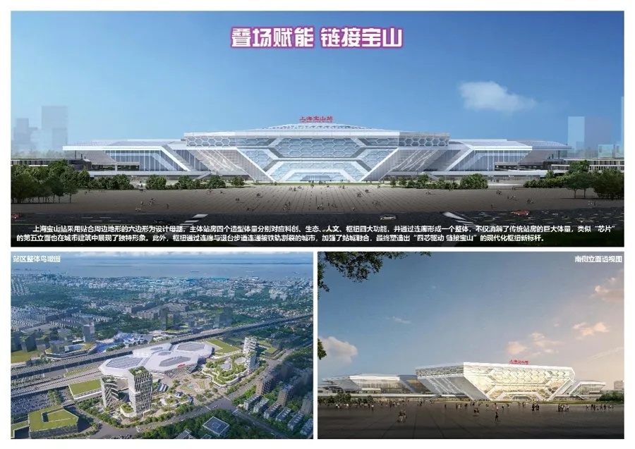 今年4月正式开工建设的上海宝山站,定位为大型高铁枢纽,设计日均铁路旅客到发量达14.5万人次,年旅客到发量约5400万人次,规模仅次于上海虹桥站、上海东站、上海站。