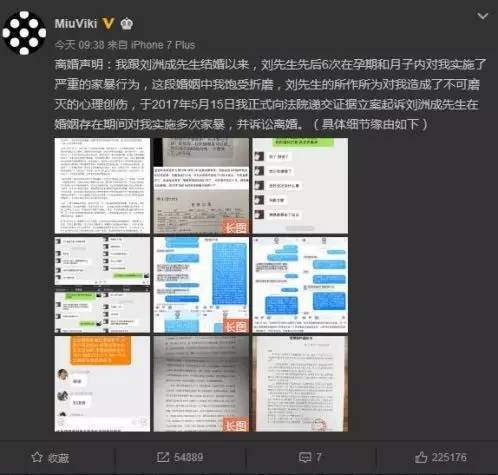 “刘先生先后6次在孕期和月子内对我实施了严重的家暴行为,这段婚姻中我饱受折磨,刘先生的所作所为对我造成了不可磨灭的心理创伤,于2017年5月15日我正式向法院递交证据立案起诉刘洲成先生在婚姻存在期间对我实施多次家暴,并诉讼离婚。”