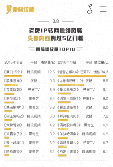 老牌IP凭借原有的人气加持,成为现象级综艺的优质潜力股。去年优酷和芒果TV联合播出的《爸爸去哪儿4》,作为老牌IP转网的标杆节目,不仅没有水土不服,还一跃成为2016年网综流量之最,占据网综总流量的13.3%。
