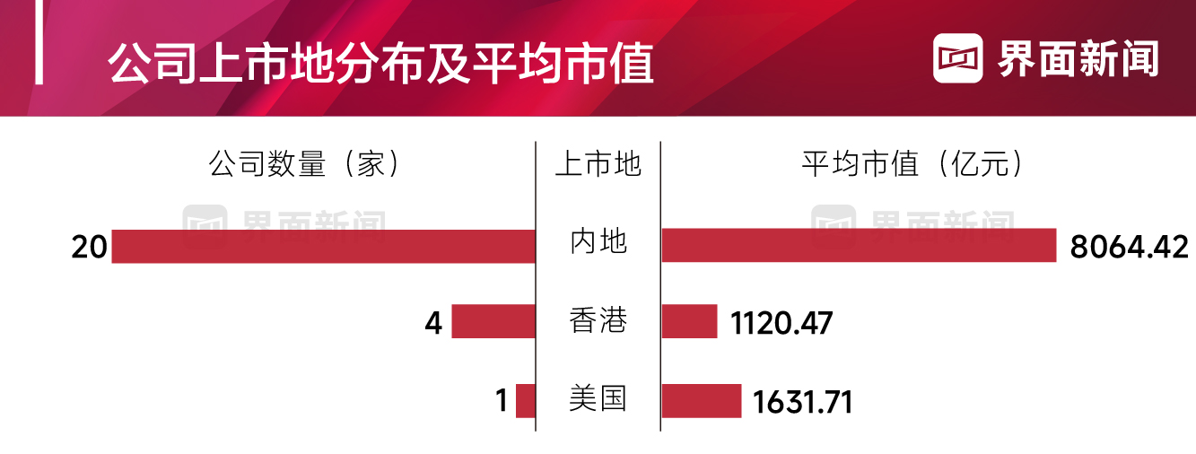 这25位CEO所在的公司,有20家在内地上市,4家在香港上市,1家在美国上市(多地上市的,以A股,港股,美股为次序)。从平均市值来看,A股市场、港股市场以及美股市场的平均市值分别8064.42亿元、1120.47亿元以及1631.71亿元。