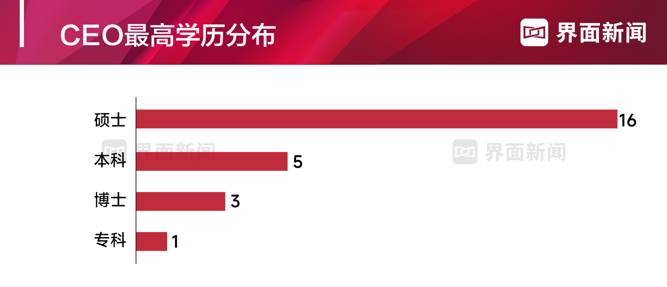 在25位上榜的CEO中,硕士和博士分别有16位和3位;有15位公开了毕业的专业,大部分皆与经济或管理相关。
