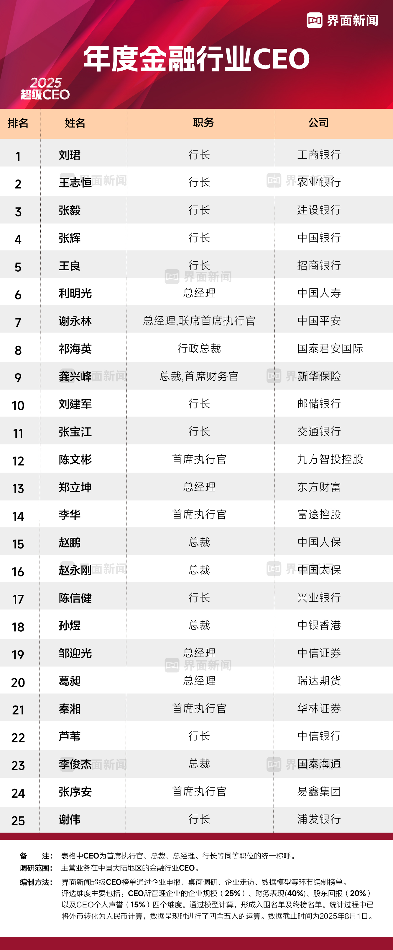 在界面新闻2025年度金融行业CEO榜单上,最终有25位CEO上榜。其中CEO是对CEO、总裁、总经理、行长等同等职位的统称。