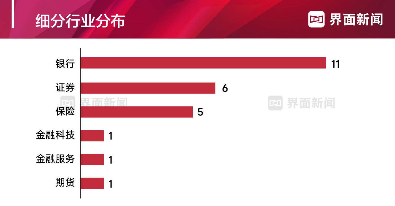 从公司主营业务来看,银行占据多数,有11家上榜。证券排名第二,有6家上榜;保险有5家上榜,排在第三名,分别是中国人寿、中国平安、新华保险、中国人保和中国太保。