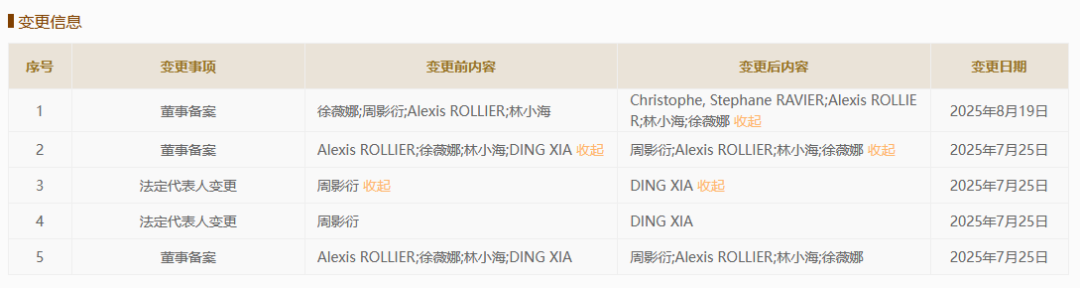 另外,周影衍在该两家公司担任董事一职,则均由Christophe Ravier接任。截止发稿前,据企查查显示,周影衍在上述两家公司已无相关职务。