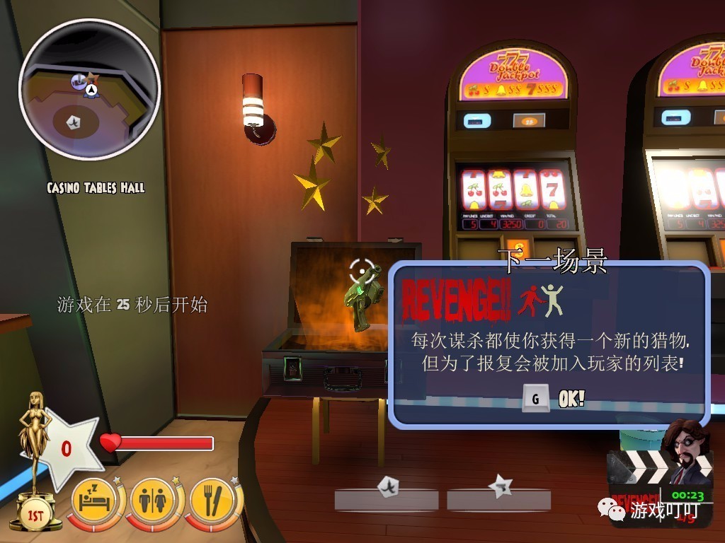 游戏开始有一个比较简单的剧情,某个心黑黑的导演要拍电影。玩家扮演的角色是演员然后根据导演的要求杀掉你的目标。同时你又是别人的目标。最后根据你杀的人获得的星的多少决定排名。听上去很有趣吧,下面我来详细介绍。