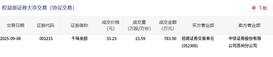 9月8日,千味央厨大宗交易成交23.59万股,成交额783.9万元,占当日总成交额的4.3%,成交价33.23元,较市场收盘价33.23元持平。