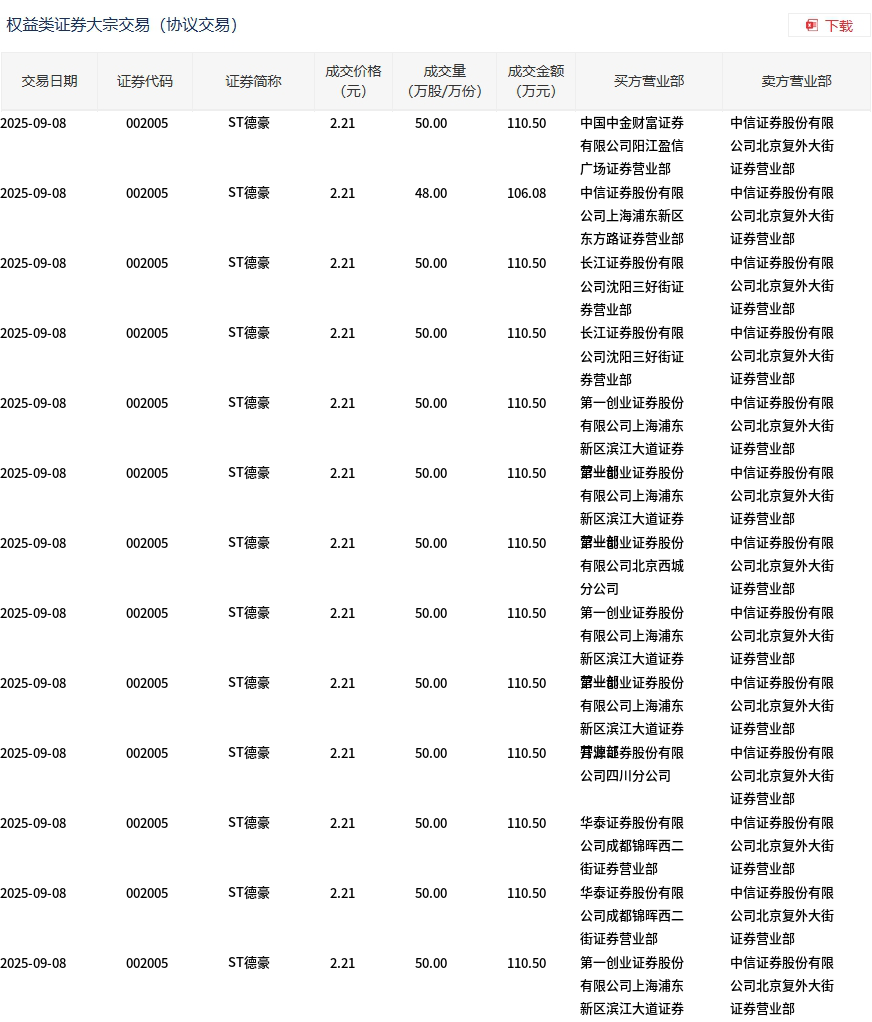 9月8日,ST德豪大宗交易成交648万股,成交额1432.08万元,占当日总成交额的23.14%,成交价2.21元,较市场收盘价2.33元折价5.15%。