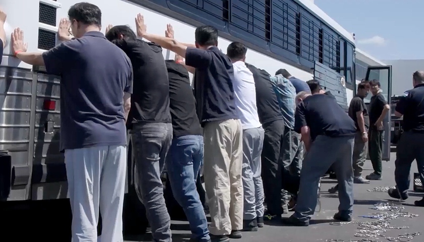 美国执法部门公布的视频显示,大批执法车辆开往在建工厂,外国工人被要求在工厂外排成长队。部分工人被要求将双手放在大巴车上,以便执法人员搜身并给工人戴上镣铐。