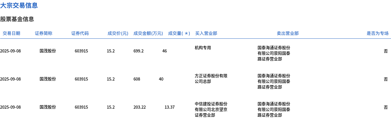 9月8日,国茂股份大宗交易成交99.37万股,成交额1510.42万元,占当日总成交额的3.29%,成交价15.2元,较市场收盘价17.17元折价11.47%。