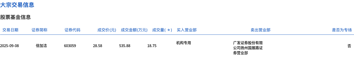 9月8日,倍加洁大宗交易成交18.75万股,成交额535.88万元,占当日总成交额的1.47%,成交价28.58元,较市场收盘价33.19元折价13.89%。