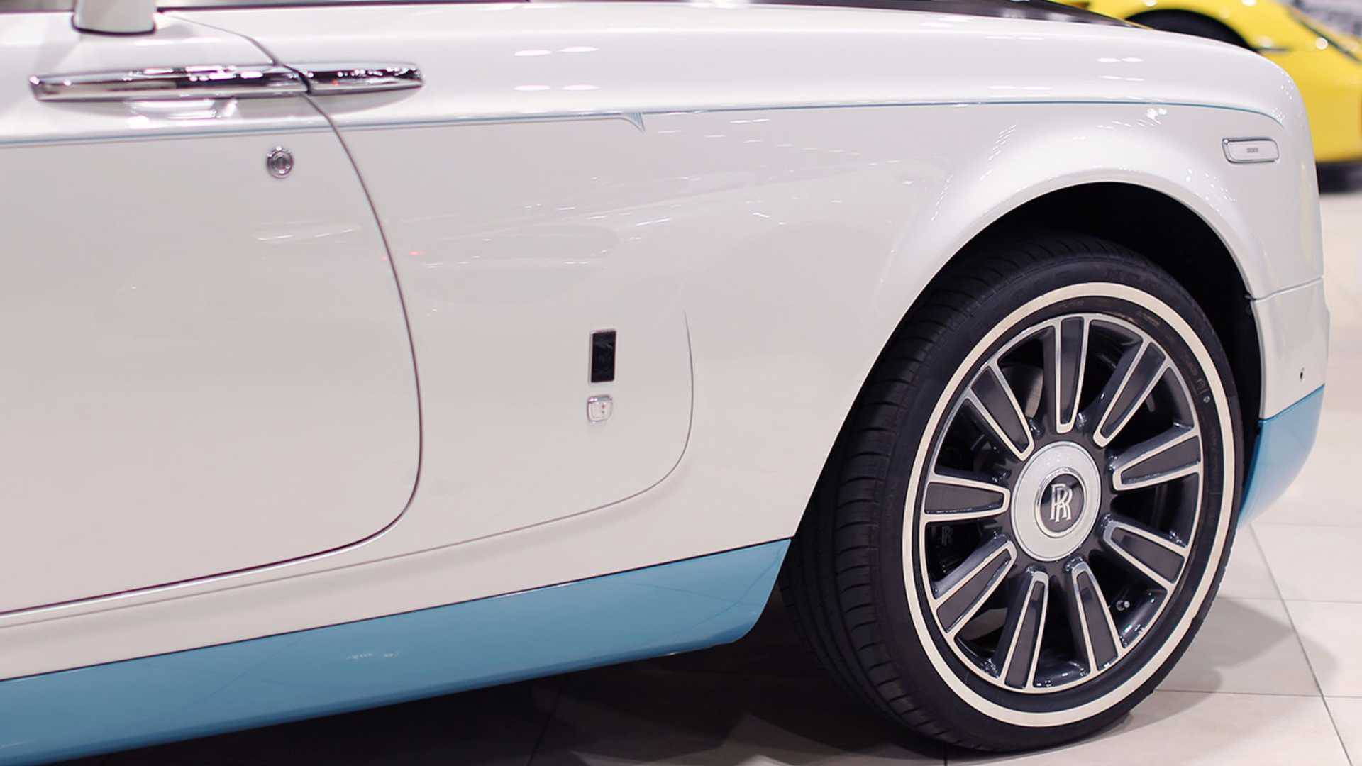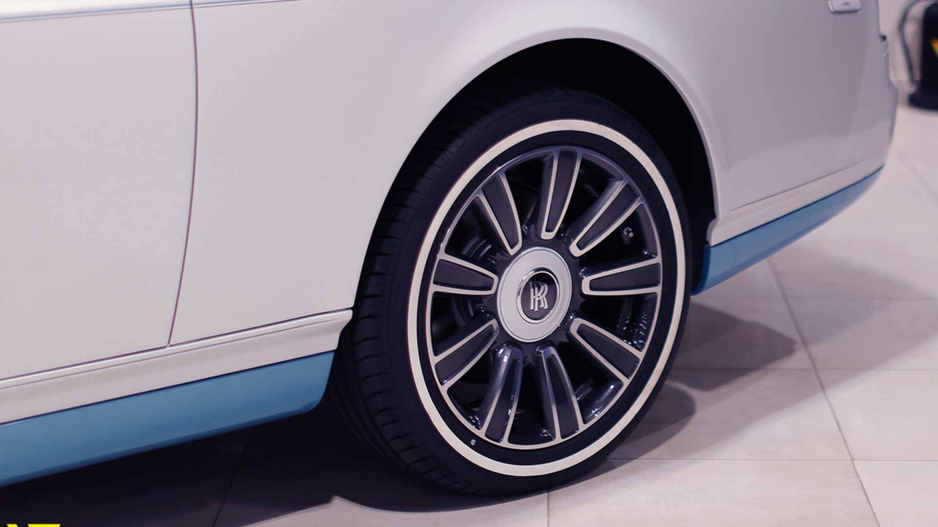 该车外观方面,前进气格栅和、机器盖甚至延伸到整个前风挡玻璃外宽都采用了拉丝铝工艺处理;使用了水晶版的车头女神雕像,晶莹剔透,点亮效果更显华丽。车身整体采用象牙白色涂装,其前后保险护板以及车身下包围均采用绿松石色车漆作为搭配。同时,新车为展现豪华气质还采用了极具复古气息的白壁轮胎和黑色轮圈。