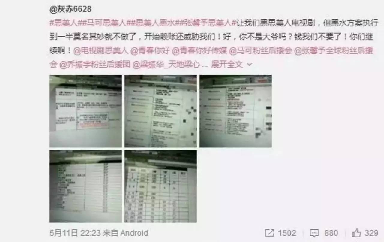 5月11日,网名为“灰赤6628”的网友发布微博称:“让我们黑《思美人》电视剧,但是黑水方案执行到一半莫名其妙就不做了,开始赖账还威胁我们!”