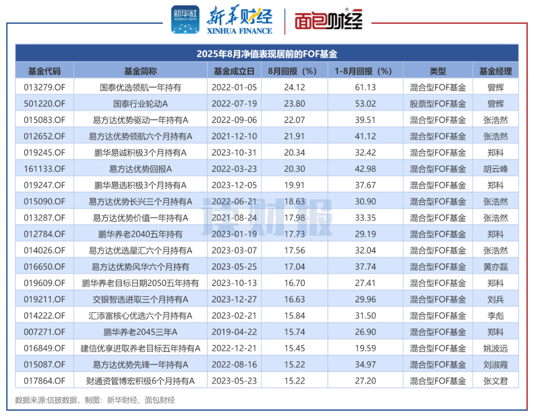 新华财经和面包财经研究员梳理的公开资料显示,2025年8月,500余只FOF基金平均收益率为5.08%、中位数收益率为4.2%,同期沪深300指数涨幅为10.33%。