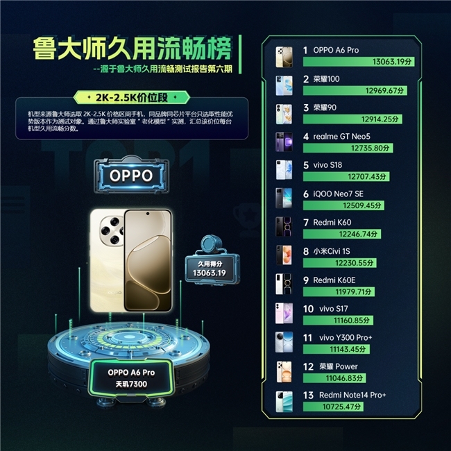 OPPO A6 Pro则是在2K-2.5K价位段斩获了鲁大师久用流畅榜冠军,其久用得分13063.19,连硬件规格及定位更高的老旗舰也被它甩在了身后。