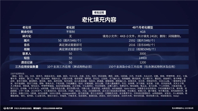 针对手机耐用度、流畅度,鲁大师拥有一套自己的“久用流畅”测试方案,该方案核心在于“模拟老化” 。目前鲁大师久用流畅测试模型已迭代至2.0版本,老化所填充到手机存储的内容有所升级:包括4KB小文件、图片、音乐、视频、联系人、通话记录及150个主流及小众三方应用,且这些数据也从以前一次性写入改为分48轮写入。
