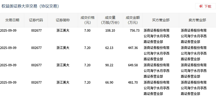 9月9日,浙江美大大宗交易成交327.35万股,成交额2335.37万元,占当日总成交额的55.38%,成交均价7.13元,较市场收盘价6.83元溢价4.45%,其中最高成交价7.2元,最低成交价7元。