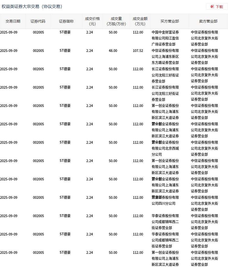 9月9日,ST德豪大宗交易成交648万股,成交额1451.52万元,占当日总成交额的19.92%,成交价2.24元,较市场收盘价2.36元折价5.08%。