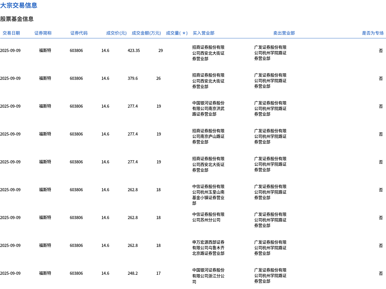 9月9日,福斯特大宗交易成交200万股,成交额2919.95万元,占当日总成交额的5.99%,成交价14.6元,较市场收盘价16.1元折价9.32%。