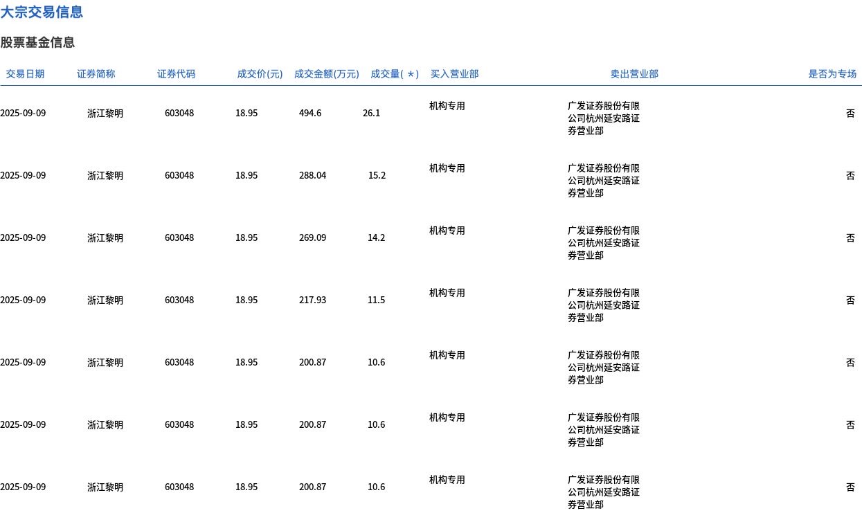 9月9日,浙江黎明大宗交易成交98.8万股,成交额1872.27万元,占当日总成交额的11.31%,成交价18.95元,较市场收盘价21.64元折价12.43%。