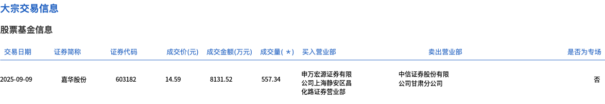 嘉华股份今日大宗交易平价成交557.34万股,成交额8131.52万元
