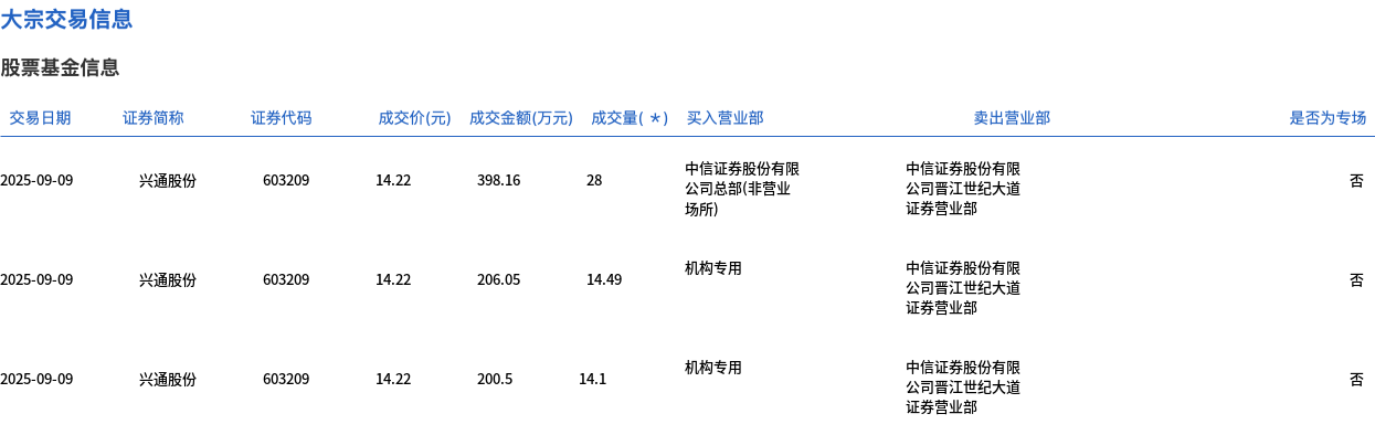 9月9日,兴通股份大宗交易成交56.59万股,成交额804.71万元,占当日总成交额的14.04%,成交价14.22元,较市场收盘价15.3元折价7.06%。