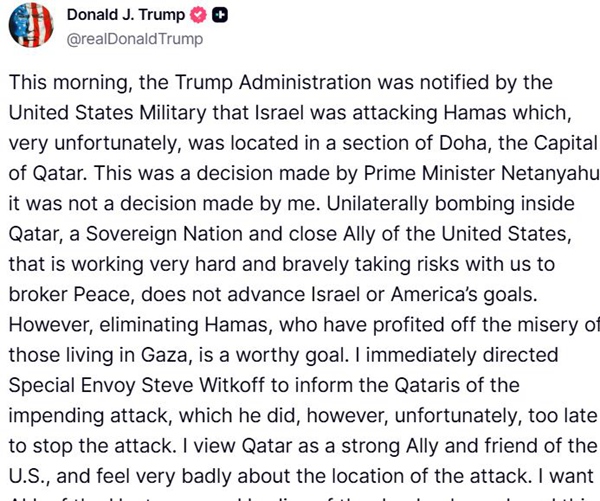 特朗普发长文表示,自己是从美军处得知以色列在多哈袭击哈马斯成员一事,“这是以色列总理内塔尼亚胡做的决定,不是我做的决定。”