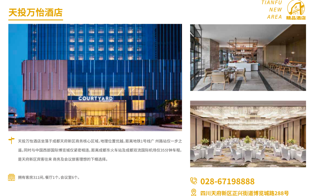 实用层面:每一家酒店都标注了详细地址、咨询电话,关键信息(如客房数量、核心设施、交通优势)一目了然 —— 比如天投万怡酒店 “距地铁 1 号线广州路站仅一步之遥”、福朋喜来登 “步行可达天府公园站”,帮你快速判断交通便利性;